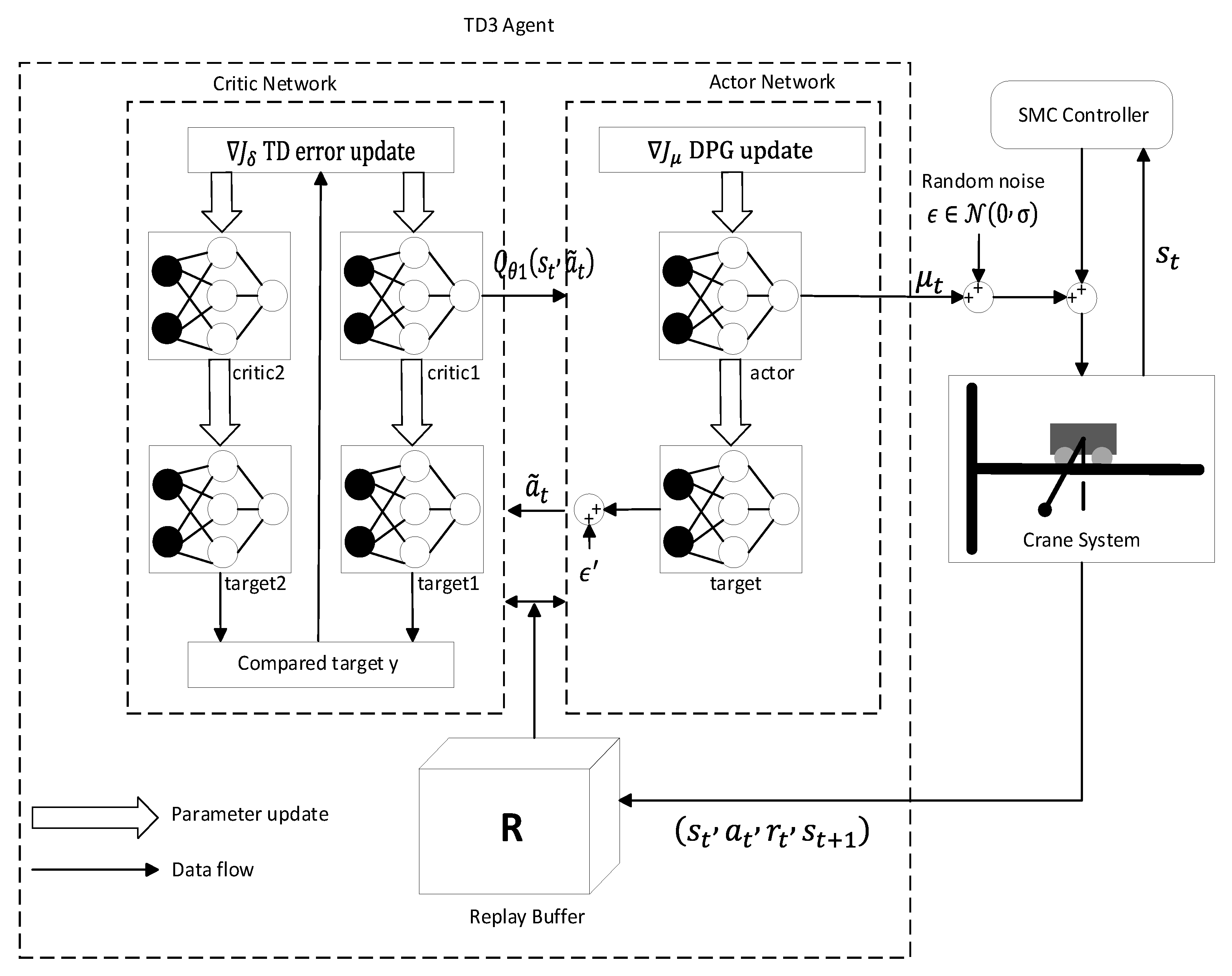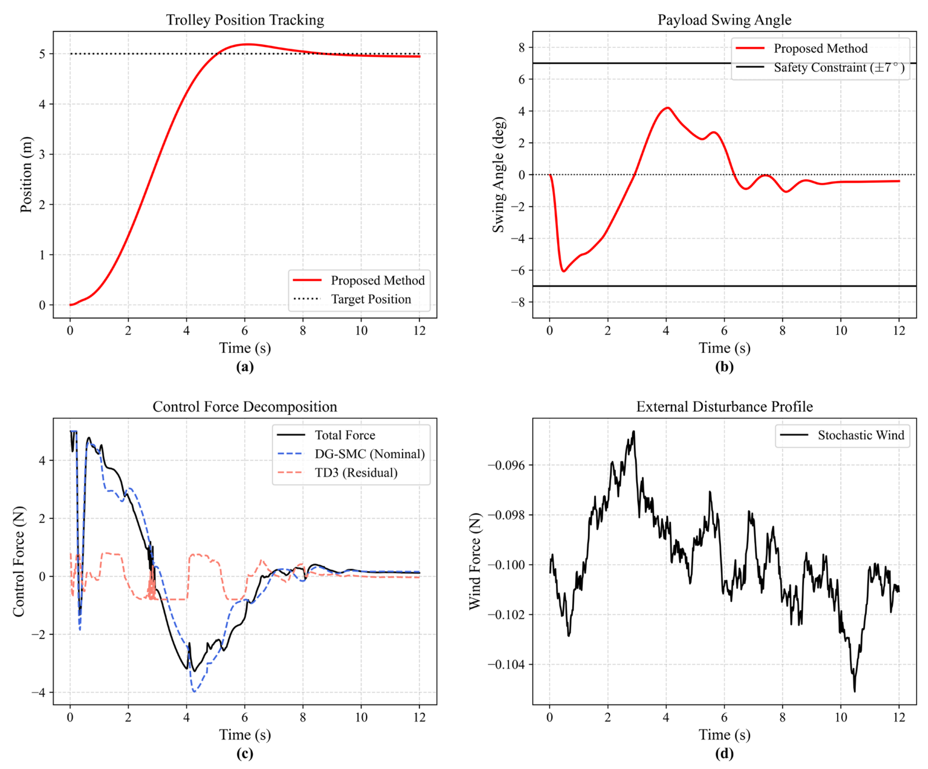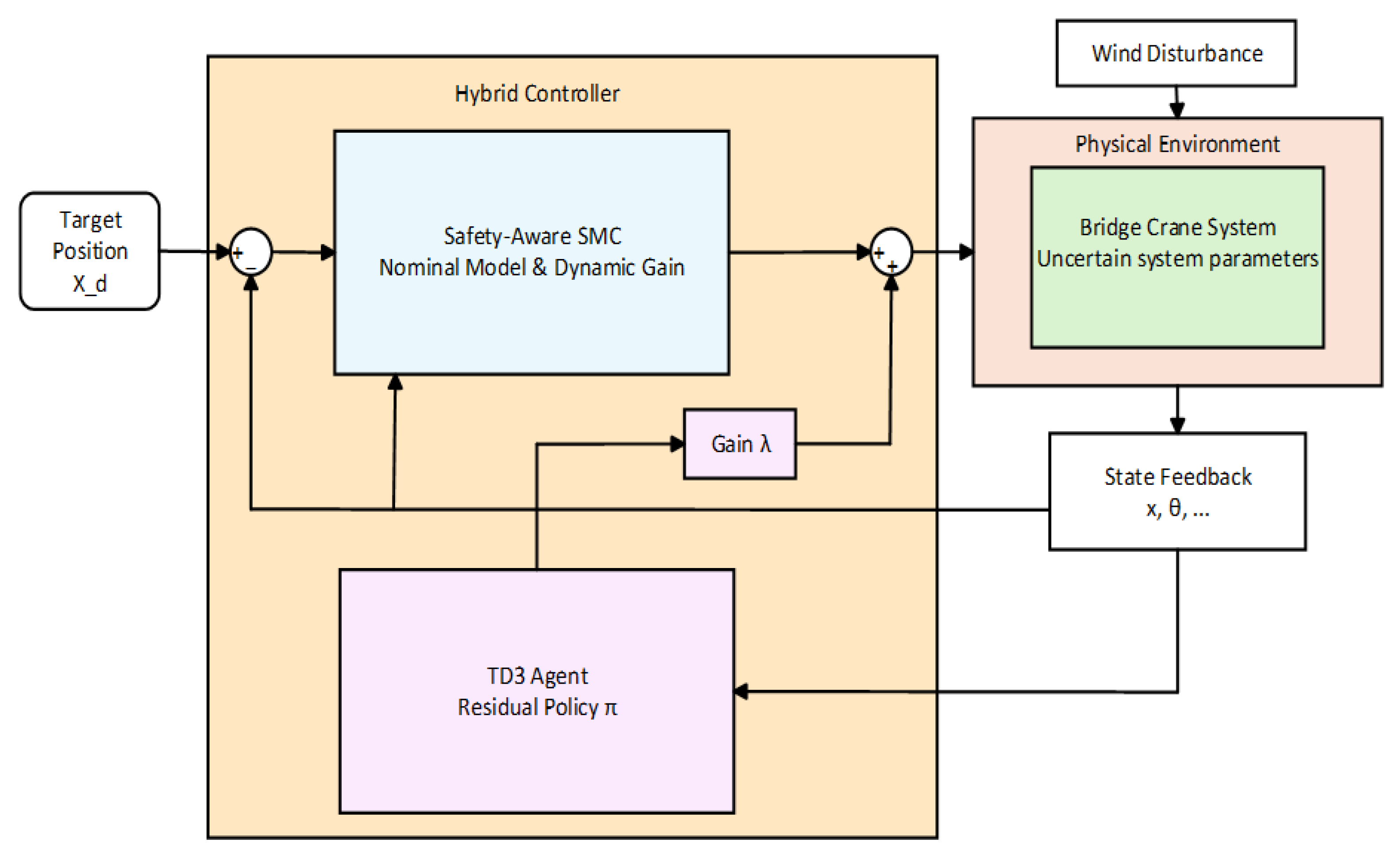 - Residual Compensation for Model Mismatch: Parameter uncertainty is addressed by employing the SMC as a baseline controller operating on nominal parameters. A TD3 agent is trained to observe state deviations arising from discrepancies between the nominal model and the physical environment (e.g., varying payload masses and friction). Subsequently, the agent generates compensatory control actions to eliminate steady-state errors and suppress continuous external wind disturbances.