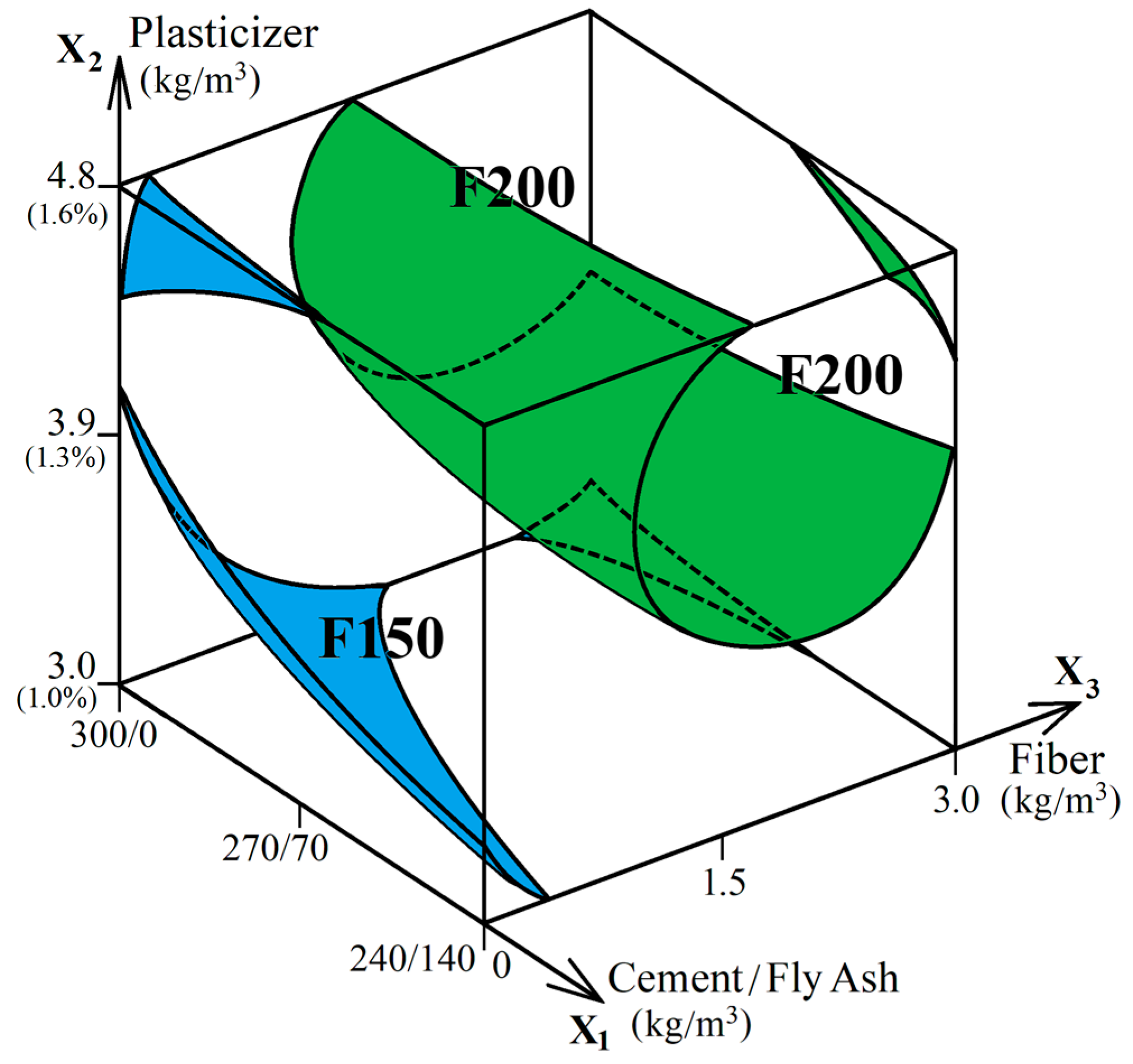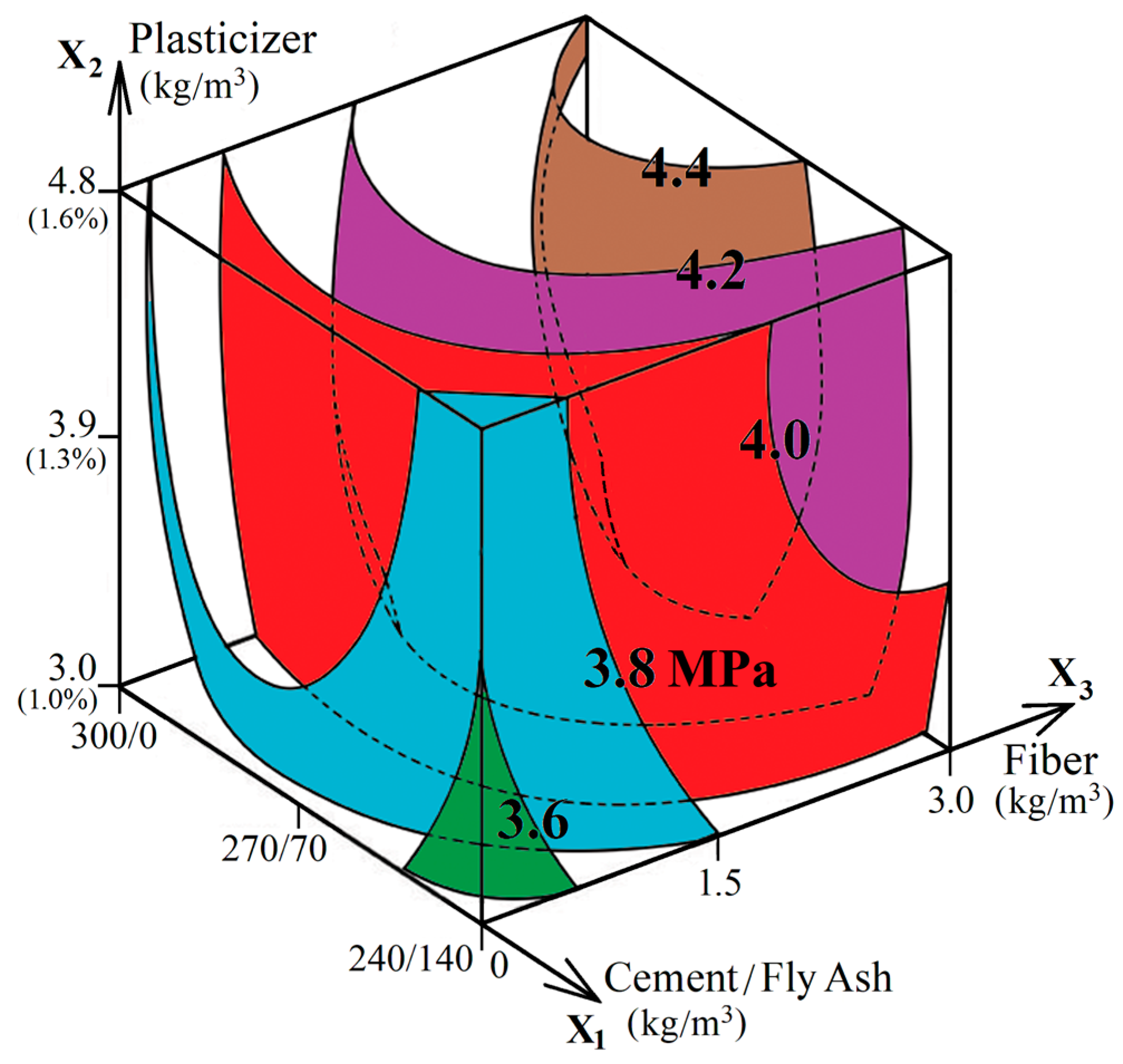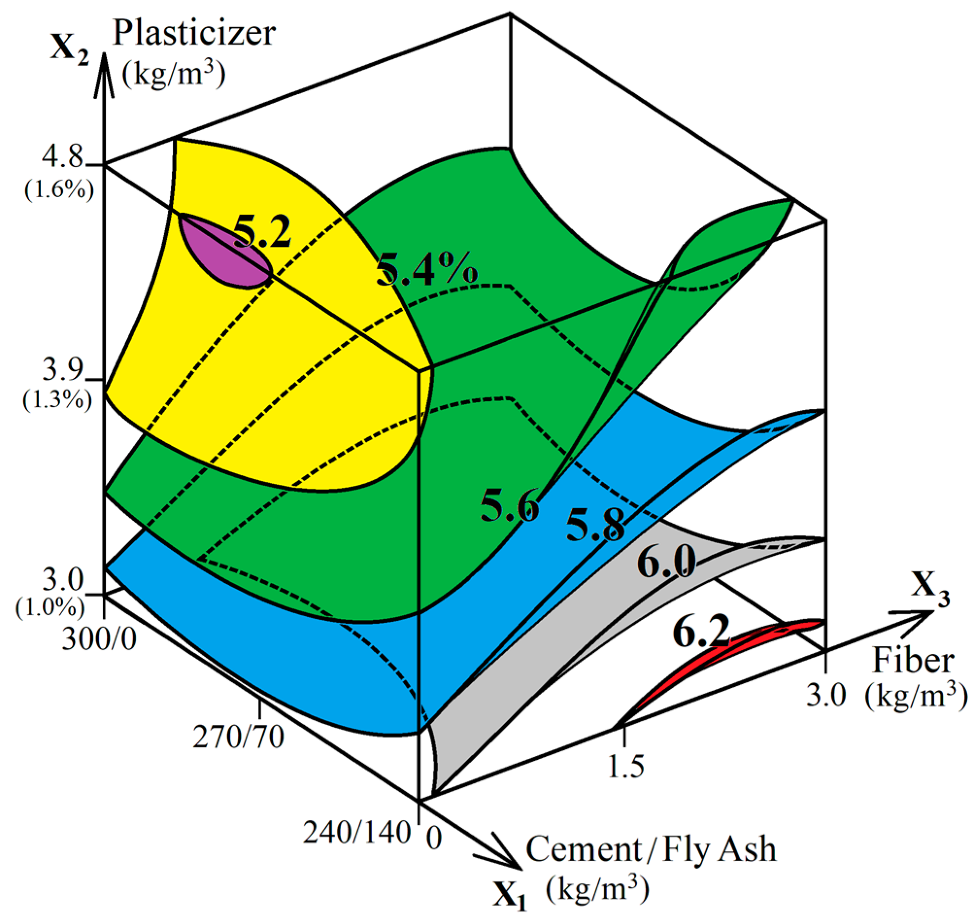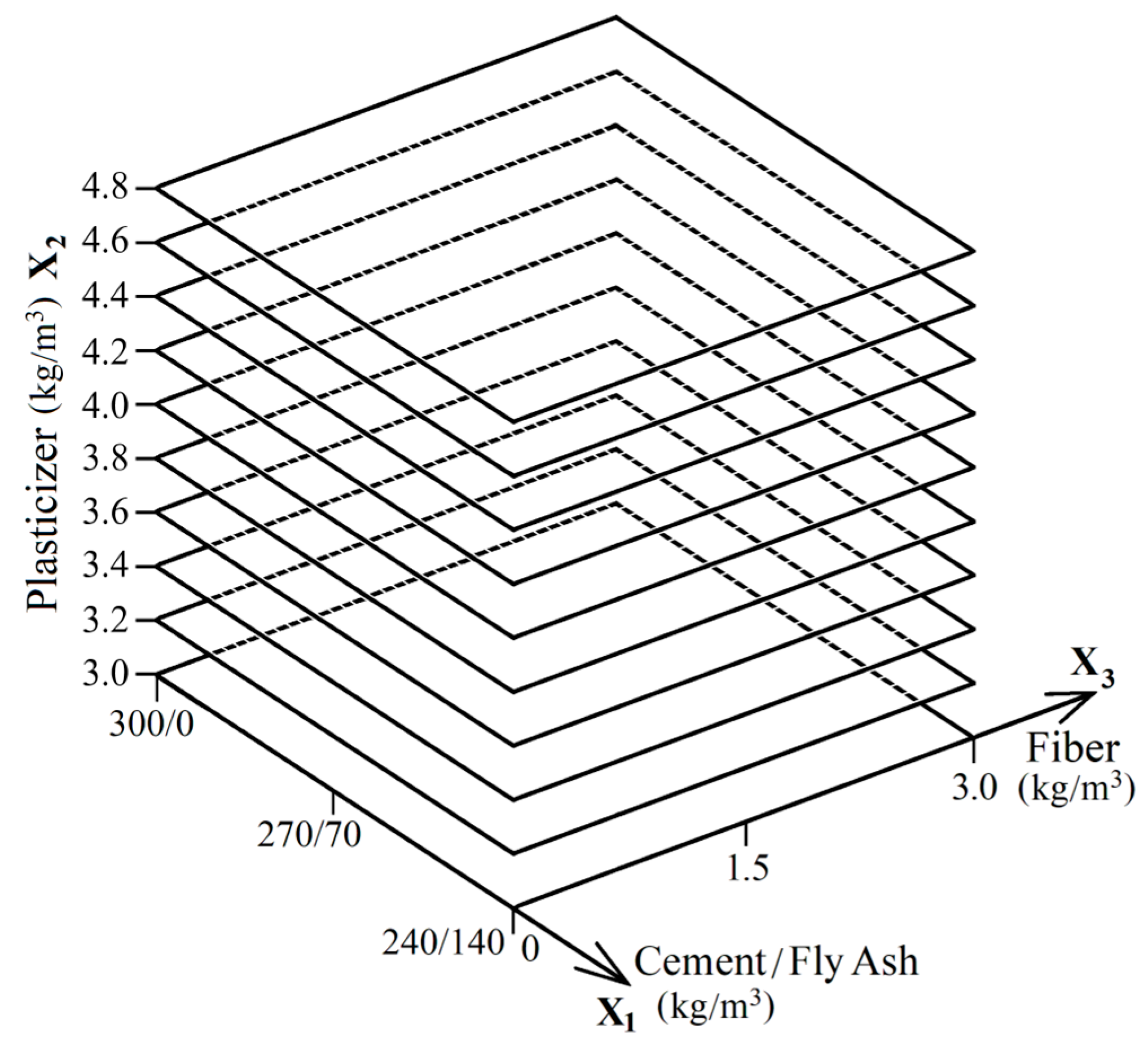 - Graphical determination of optimal concrete compositions within the three-dimensional factor space using superimposed contour plots and graphical optimization techniques;