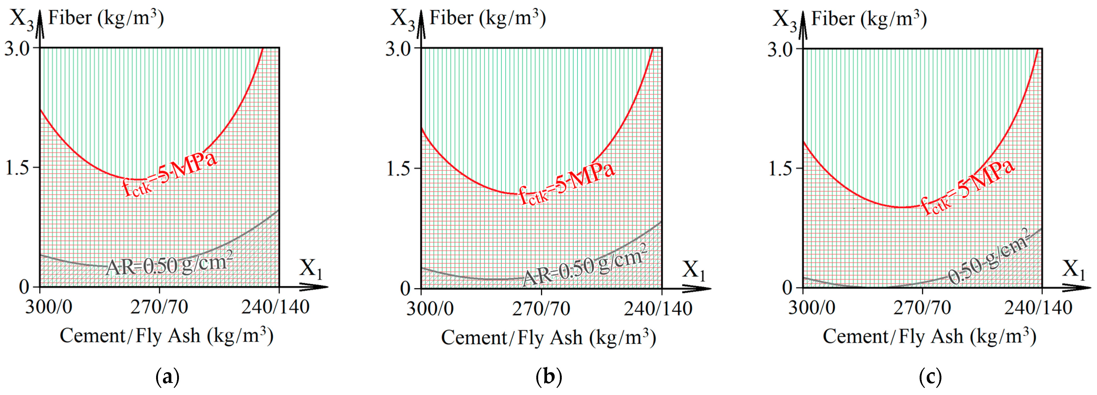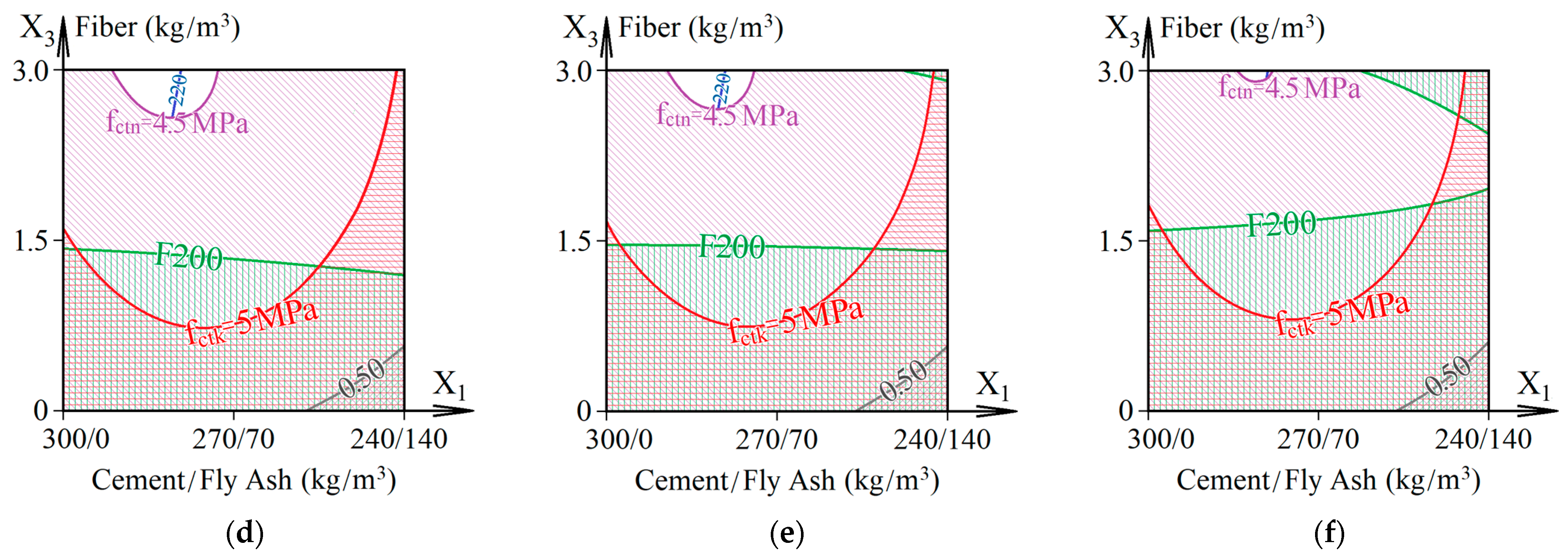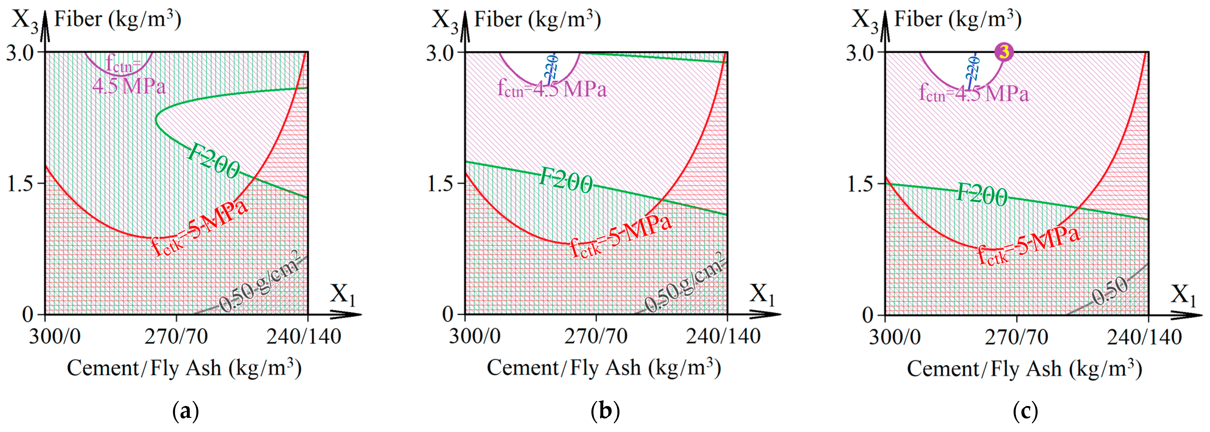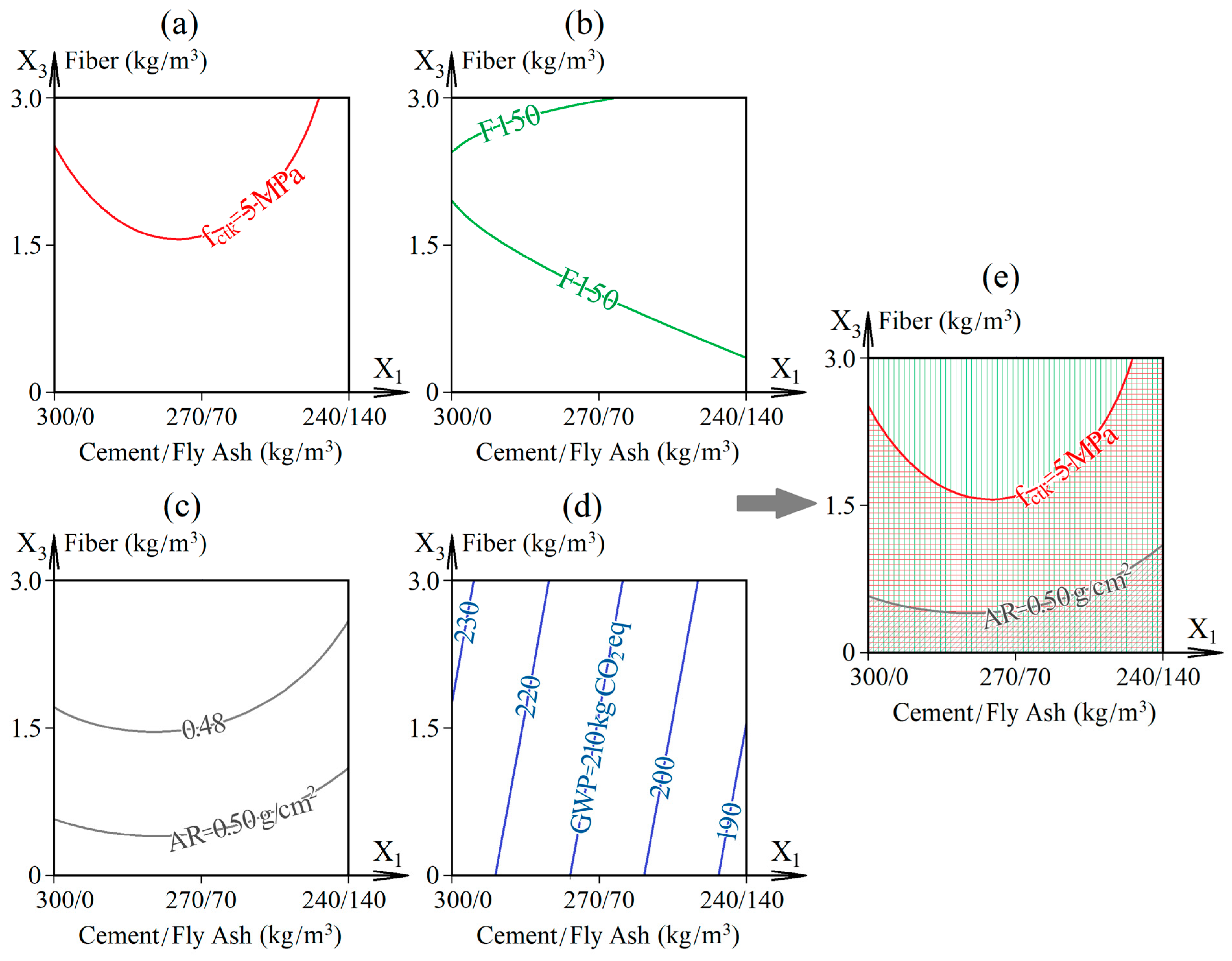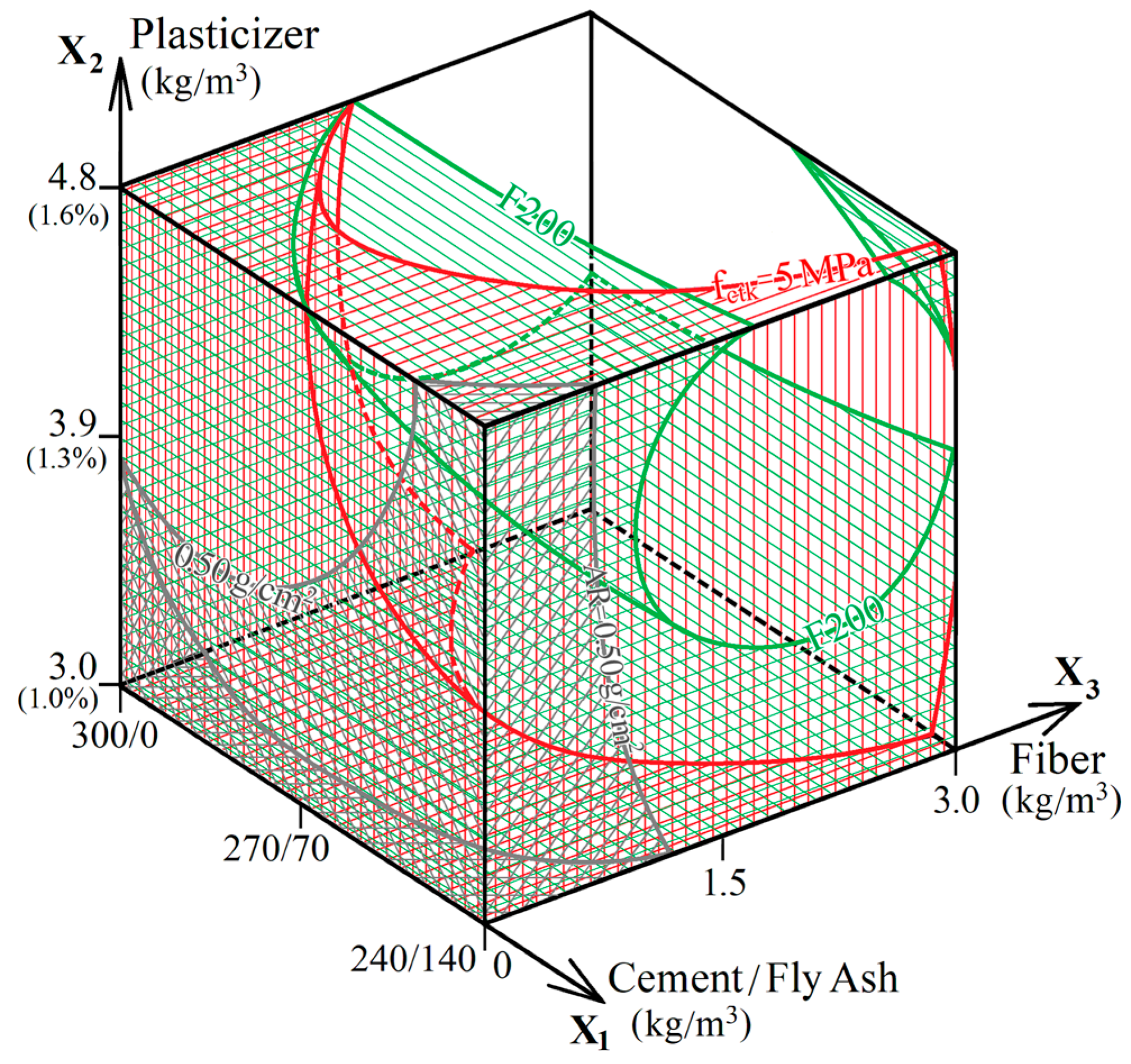 | 3 | x1 = −0.07 x2 = 0.333 x3 = 1 | Cement 272 kg/m3 FA 65.5 kg/m3 RA 1090 kg/m3 Sand 751 kg/m3 PF 3 kg/m3 SP 4.2 kg/m3 Water 131 L/m3 | Compressive strength 55.9 MPa Flexural strength 5.2 MPa Splitting tensile strength 4.5 MPa FR F200 (cycles) AR 0.458 g/cm2 GWP 215.3 kg CO2 eq |