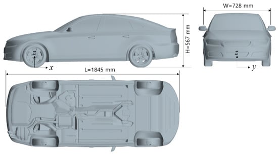 To maintain consistency with the experimental geometric configuration, the present study employs a 1:2.5 scale fastback model as the research subject. In order to simulate the actual operating conditions, the model neglects the cooling airflow, incorporates a sealed grille, and retains the detailed geometry of the standard chassis. A three-dimensional view of the DrivAer model is shown in Figure 1.