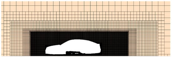The grid refinement region on the y = 0 m plane for the fine mesh scheme is illustrated in Figure 3. As shown in Figure 3, three large refinement zones are arranged around the vehicle. To accurately capture the flow characteristics at the rear of the vehicle, an extended refinement area is specifically applied in the wake region.