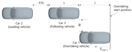 A schematic diagram of the overtaking process is shown in Figure 6. The overtaking vehicle is designated as Car 1, while the vehicles being overtaken are referred to as Car 2 and Car 3. All vehicles travel in the positive x-axis direction, with the y-axis defined as perpendicular to the x-axis and pointing toward the vehicle body. Existing literature on vehicle platooning suggests that effect of lateral spacing between two vehicles becomes negligible in terms of lateral force interaction when the spacing approximates twice the vehicle width. As spacing decreases, lateral forces increase rapidly, indicating that the safe lateral distance for side-by-side driving should lie between one vehicle width and half a vehicle width. To ensure safe overtaking, this study adopts a lateral spacing of W (one vehicle width) [26]. Considering the average drag of the platoon configuration, the wake effect is beneficial for platoons with inter-vehicle spacing . Taking lateral overtaking scenarios into account, the ideal longitudinal position ranges from to . After comprehensive consideration, the longitudinal spacing between vehicles within the platoon is set to 0.5 L (0.5 vehicle length) [27]. The longitudinal travel distance of Car 1 in each phase is represented by , where the positive direction of is aligned with the vehicle’s direction of travel. In this study, the normalized parameter is used to represent the relative longitudinal position of Car 1, where L denotes the vehicle length. With a phase interval of 0.5 , eight simulation cases are selected, covering the range to 3.5.