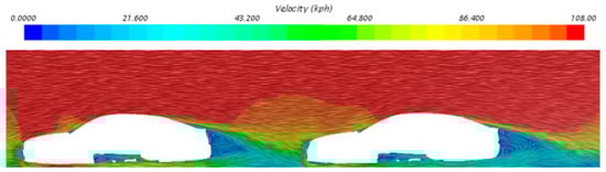 Distribution of streamlines provide an intuitive visualization of airflow direction, offering direct insight for assessing flow field variations. Figure 9 presents the streamline plot for the y = 0 plane of the vehicle queue. From the figure, it can be observed that the airflow passing over the rear and undercarriage of Car 2 converges beneath the front of Car 3, forming a rearward-directed flow. The redistribution of airflow significantly reduces the volume of flow directly impacting the front section of Car 3, thereby decreasing the pressure at the vehicle’s front. The overall effect results in a slight pressure drop in the wake region, coupled with a significant reduction in front pressure, leading to a decreased overall pressure differential across the vehicle body. However, the drag coefficient remains higher than that of Car 2.