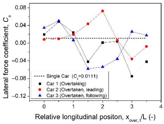 Variation in lateral force coefficient (CS) of the three vehicles during the overtaking process.