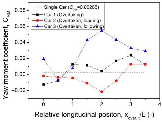 Variation in yaw moment coefficient (CYM) of the three vehicles during the overtaking process.