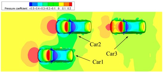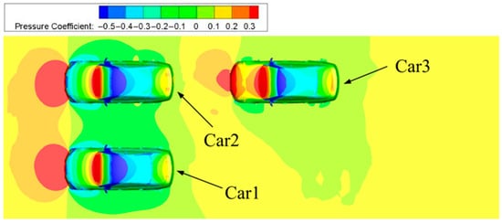 The pressure distribution on the z = 0.15 m plane for the two-vehicle platoon is shown in Figure 7. The high-pressure region at the front of Car 2 is more pronounced than that at the corresponding location on Car 3. Conversely, the low-pressure region near the rear of Car 2 is smaller than that of Car 3. As a result, the overall pressure differential between the front and rear of Car 2 is less than that of Car 3, resulting in a higher drag coefficient (CD) for Car 3. As the airflow passes over the vehicle body, it splits to both sides, forming a low-pressure region along the vehicle’s lateral surfaces. In the platoon configuration, the low-pressure zones on either side of both vehicles remain largely symmetrical. This symmetry leads to only minor differences in the lateral force coefficient (CS) between the two cars, which helps maintain straight-line driving stability within the platoon. When there is a significant pressure difference between the front and rear of a vehicle, notable yaw moments may be generated [8]. For Car 2, the elevated pressure at the front induces a clockwise yaw moment, while the increased pressure at the rear generates a counteracting counterclockwise yaw moment, leading to internal yaw moment cancelation. In contrast, since Car 3 is located within the wake of Car 2, the pressure at the front of Car 3 is reduced, resulting in consistent counterclockwise yaw moments acting on both the front and rear. This causes a stronger tendency for Car 3 to yaw toward the left. Consequently, the absolute value of the yaw moment coefficient (CYM) for Car 3 is greater than that of Car 2.