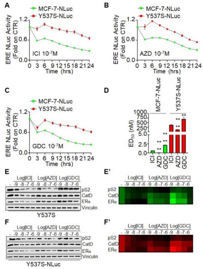 To directly evaluate this observation, we treated both normal Y537S and Y537S-NLuc cells with different doses of both ICI, AZD, and GDC for 24 h and evaluated pS2, CatD, and ERα expression levels. As shown in Figure 2E,F and Figure 2E′,F′, SERDs equally reduce pS2 and CatD and induce receptor degradation in either cell line. However, while a similar dose-dependent effect was observed for ICI and AZD, GDC was less effective than ICI and AZD to reduce pS2 and CatD expression and to induce Y537S ERα mutated receptor degradation.