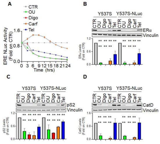 Sensitivity of Y537S NLuc cells to some FDA-approved drugs. (A) Profile of ERE-NLuc activity detected in Y537S-NLuc cells treated with ouabain (OU—10−7 M), digoxin (Digo—10−6 M), carfilxomib (Carf—10−6 M), and telaprevir (Tel—20 µM) in the presence of the live-cell substrate Nano-Glo® EndurazineTM. Released light units (RLU) were measured for 24 h every other 5 min in a 37 °C and 5% CO2-controlled atmosphere. The graph shows the compound effect calculated every other 3 h with respect to its relative control sample. The data are the means of two different experiments in which each sample was measured in triplicate (for details please see the material and method section). Western blotting and relative densitometric analyses of ERα (B), presenilin-2 (pS2) (C), and cathepsin D (Cat D) (D) expression in Y537S cells Y537S-NLuc cells treated for 24 h with ouabain (OU—10−7 M), digoxin (Digo—10−6 M), carfilzomib (Carf—10−6 M) and telaprevir (Tel—20 µM). Significant differences with respect to the CTR sample were determined by unpaired two-tailed Student’s t-test: **** p < 0.0001; ** p < 0.01.