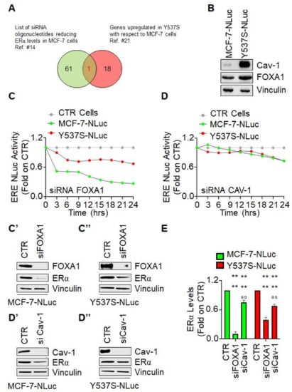 Sensitivity of Y537S NLuc cells to FOXA1 and caveolin-1 depletion. (A) Venn diagram indicating the dataset used to select caveolin-1 for further analysis. (B) Western blotting analyses of FOXA and caveolin-1 (Cav-1) expression in MCF-7-NLuc and Y537S-NLuc cells. Profile of ERE-NLuc activity detected in MCF-NLuc and Y537S-NLuc cells treated with siRNA oligonucleotides against FOXA1 (C) and caveolin-1 (D) in the presence of the live-cell substrate Nano-Glo® EndurazineTM. Released light units (RLU) were measured for 24 h every other 5 min in a 37 °C and 5% CO2-controlled atmosphere. Graphs show the compound effect calculated every other 3 h with respect to its relative control sample. The data are the means of two different experiments in which each sample was measured in triplicate (for details please see the material and method section). Western blotting analyses of ERα and FOXA1 expression in MCF-7-NLuc (C′) and Y537S-NLuc cells (C″). Western blotting analyses of ERα and caveolin-1 (Cav-1) expression in MCF-7-NLuc (D′) and Y537S-NLuc (D″) cells. (E) ERα densitometric analyses of the blots depicted in (C′–D″). Significant differences with respect to the CTR sample were determined by unpaired two-tailed Student’s t-test: **** p < 0.0001. Significant differences with respect to the siFOXA1 sample were determined by unpaired two-tailed Student’s t-test: °° p < 0.01.