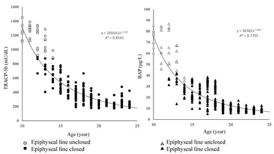 Bone metabolism markers varied significantly with age. TRACP-5b and BAP values were highest in the bone elongation phase and then decreased exponentially through the bone formation phase to the maturation phase.
