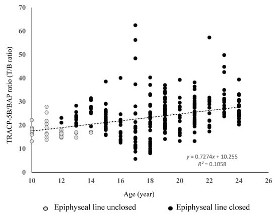 TRACP-5 and BAP were highest in the bone elongation phase, in which the epiphyseal line was not closed, and decreased exponentially toward the bone formation and bone maturation phases (bone elongation phase TRACP-5b 1224 ± 134 mU/dL, BAP 81 ± 14 μg/L; bone formation phase TRACP-5b 426 ± 156 mU/dL, BAP 14 ± 7 μg/L; bone maturation phase TRACP-5b 298 ± 34 mU/dL, BAP 11 ± 4 μg/L). To overcome the large individual differences and errors in these results, we calculated the TRACP-5b/BAP ratio (T/B ratio) as the ratio of bone resorption to bone formation as an indicator of the bone turnover rate. The T/B ratio increased linearly with age (Figure 2).