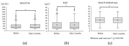 Bone metabolism markers before and at 3 months after administration of DNG 1 mg/day showed no significant changes in TRACP-5b (before, 455.6 ± 323.6 mU/dL; 3 months after, 462.1 ± 346.1 mU/dL), BAP (before, 24.7 ± 19.0 μg/L; 3 months after, 25.2 ± 22.3 μg/L), or the TRACP-5b/BAP ratio (before, 22.1 ± 7.0; 3 months after, 21.5 ± 6.3) (p = 0.71) (Figure 3).