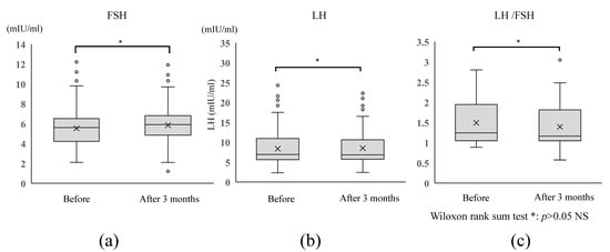 Gonadotropins before and at 3 months after administration of DNG 1 mg/day showed no significant changes in FSH (before, 5.5 ± 1.8 mIU/mL; 3 months after, 6.1 ± 1.9 mIU/mL), LH (before, 7.6 ± 3.5 mIU/mL; 3 months after, 7.3 ± 2.9 mIU/mL), or FSH/LH (before, 1.6 ± 2.1 mIU/mL; 3 months after, 1.5 ± 1.7 mIU/mL) (p = 0.96) (Figure 4).