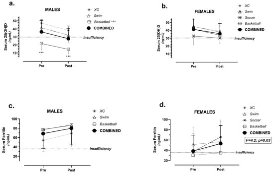 Figure 1. Pre-season to post-season changes in serum 25-OH Vitamin D and serum ferritin concentrations by sex (males (a) and (c); females (b) and (d)) and by sports team. *** p < 0.001 between Basketball vs. XC and Swim, both pre-season and post-season (a) p < 0.05 between Soccer vs. Swim and Basketball for ∆ serum ferritin (d).