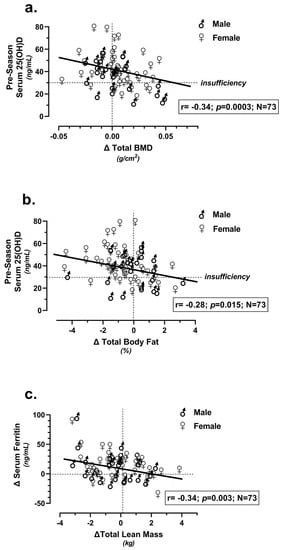 Figure 2. Statistically significant correlations between pre-season serum 25-OH-Vitamin D and changes (∆: post- minus pre-season change) in bone mineral density (BMD) (a) and total body fat % (b) as well as between changes in serum ferritin and changes in total body lean mass (c) when all athletes were combined (N = 73).