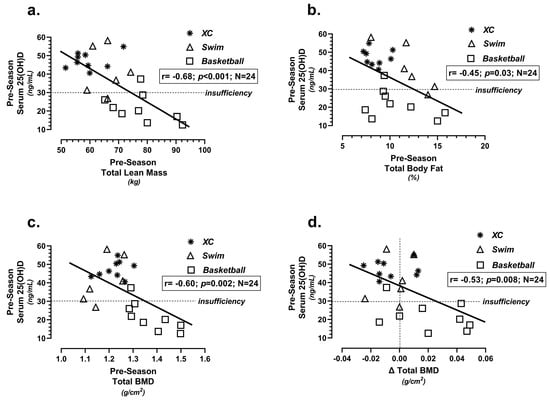 When the male cohort (n = 24) was analyzed separately, stronger negative correlations were noted between pre-season 25(OH)D versus all three major body composition variables, pre-season (Figure 3a–c) and with BMD ∆ (Figure 3d). The correlation coefficients suggested a moderate effect [] among 25(OH)D levels versus body composition variables. Of particular note, male basketball players paradoxically demonstrated the lowest 25(OH)D blood biomarker levels, of all athletes tested, but had the most favorable body composition parameters recorded (i.e., highest BMD and lean mass, with the lowest body fat percentage).