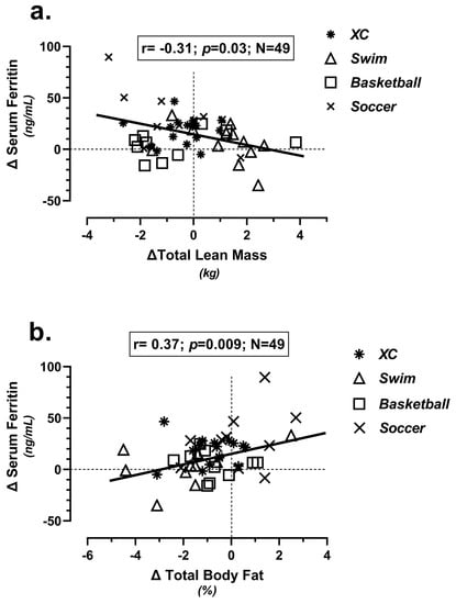Figure 4. Statistically significant correlations between changes (∆: post- minus pre-season change) in serum ferritin concentration and changes in total body lean mass (a) and changes in total body fat % (b) for the female cohort only (n = 49).