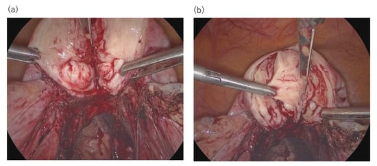 - Takeuchi, H.; Kitade, M.; Kikuchi, I.; Shimanuki, H.; Kumakiri, J.; Kitano, T.; Kinoshita, K. Laparoscopic adenomyomectomy and hysteroplasty: A novel method. J. Minim. Invasive Gynecol. 2006, 13, 150–154. [Google Scholar] [CrossRef]