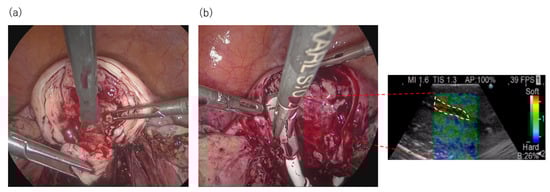 - Ota, Y.; Ota, K.; Takahashi, T.; Suzuki, S.; Sano, R.; Shiota, M. New surgical technique of laparoscopic resection of adenomyosis under real-time intraoperative ultrasound elastography guidance: A case report. Heliyon 2020, 6, e04628. [Google Scholar] [CrossRef] [PubMed]