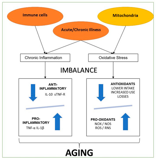 Summary inflammation and oxidative process of aging. The present graphic comprises the most accepted theories of aging. Immune cell and mitochondrial disfunction, with concomitant chronic or acute illness. Two metabolic ways of harm, both marked with a profound imbalance. One through cytokines, with lower plasma levels of anti-inflammatory markers (Il-10: Interleukin 10, sTNF-R: Soluble tumor necrosis factor receptor) and increased pro-inflammatory markers (IL-1β: Interleukin 1 beta, TNF-α: Tumoral necrosis factor-alpha). The other through oxidants imbalance, lower antioxidants levels due to lower nutritional intake, increased use due to acute or chronic illness, and losses through digestive and renal dysfunctions. Increased oxidants plasma levels (NOX: NADPH oxidases, NOS: nitric oxide synthase, ROS: Reactive oxygen species, RNS: Reactive nitrogen species) due to mitochondrial dysfunction and inflammatory states triggered due to acute or chronic illness.