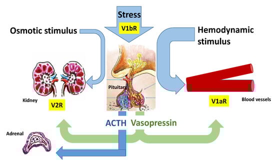 By binding pituitary V1b-R, AVP amplifies CRH stimulation on corticotrophs via a two-phase increase in cytosolic calcium resulting in a maximal secretagogue action, which is far more pronounced than the sum of their two separate effects []: this redundant, backup mechanism ensures the stress response is properly triggered, being essential both for survival—particularly in conditions of altered glucocorticoid feedback, such as bilateral adrenalectomy or chronic HPA hyperactivation, Cushing’s syndrome (CS) and pseudo-Cushing’s states included—and for immunomodulation (the HPA axis regulates the activity of T suppressor lymphocytes) [,]. Moreover, AVP binding to the V1b-R located in the adrenal medulla and pancreatic islets of Langerhans results in short-term catecholamine secretion and long-term glucose-dependent insulin or glucagon release aimed at enhancing the body performance and preserving energy throughout the stress response [].