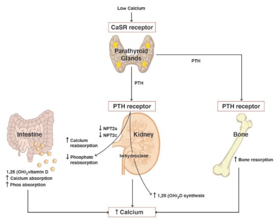 - Thakker, R.V.; Richard Bringhurst, F.; Jüppner, H. Chapter 61—Regulation of Calcium Homeostasis and Genetic Disorders that Affect Calcium Metabolism. In Endocrinology: Adult and Pediatric, 7th ed.; Jameson, J.L., De Groot, L.J., de Kretser, D.M., Giudice, L.C., Grossman, A.B., Melmed, S., Potts, J.T., Jr., Weir, G.C., Eds.; W.B. Saunders: Philadelphia, PA, USA, 2016; pp. 1063–1089.e10. [Google Scholar] [CrossRef]