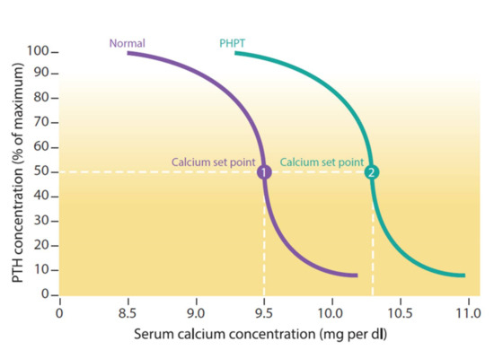 The purple line shows the normal relationship between calcium and parathyroid hormone concentrations and the green primary hyperparathyroidism (PHPT) curve is shifted to the right (higher levels of PTH at each calcium). The calcium set point (dotted line) corresponds to the concentration of calcium at which PTH secretion is at 50%. In primary hyperparathyroidism (PHPT), PTH is less sensitive to calcium, leading to higher levels of calcium [19,41,42].