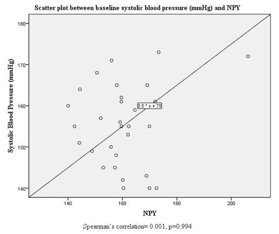 Scatter plot and correlation between systolic blood pressure and serum neuropeptide Y levels at baseline.