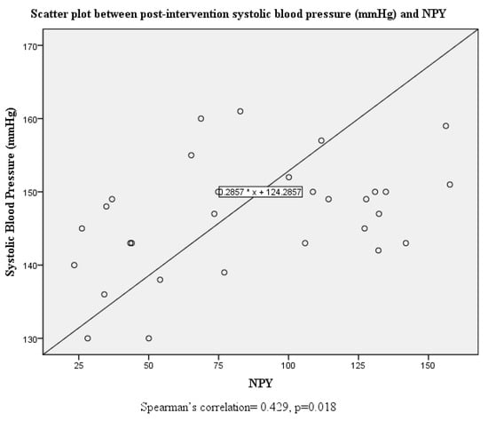 Scatter plot and correlation between systolic blood pressure and serum neuropeptide Y levels post intervention.