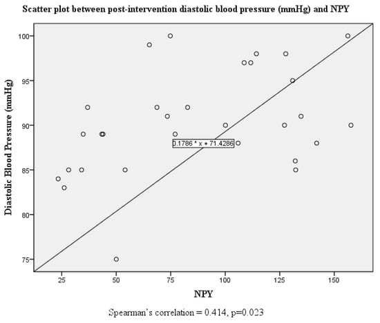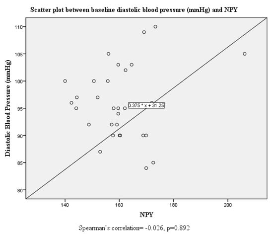 Although there were no significant correlations between systolic and diastolic blood pressure and serum neuropeptide Y levels at baseline, this was altered post-intervention where both systolic and diastolic blood pressure were positively correlated with serum neuropeptide Y levels (Figure 1, Figure 2, Figure 3 and Figure 4).