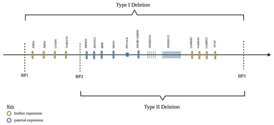 Genes in the PWS critical region, chromosome 15q11.2-q13. Created with BioRender.com (accessed on 25 March 2022).