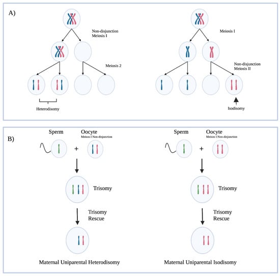 (A) A representation of non-disjunction events in meiosis leading to abnormal chromosome copy numbers in gametes. Hetrodisomy refers to a gamete with each copy of a chromosome present. Isodisomy refers to a gamete with two copies of the same chromosome present. (B) Trisomy rescue leading to maternal uniparental disomy. Trisomy rescue in these cases does not always result in a maternal uniparental disomy in the cases outlined above; a maternal chromosome could have been lost. The outcomes of interest are displayed in the figure. Created with BioRender.com (accessed on 25 March 2022).