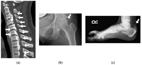 We examined the prevalence of enthesopathies in 25 adult XLH patients (18 to 72 y) and revealed a high prevalence of OPLL (32%), osteophytes around the hip joints equivalent to a Kellgren–Lawrence grade of 2 and more (96%), and enthesopathies in the Achilles tendon (72%), which explained that XLH is an obvious genetic condition in which patients are prone to developing enthesopathies [4]. Normal to high BMD in adult XLH patients was also reported in the same article and was attributed to the same osteogenic nature of XLH [4]. In some adult XLH patients, neurological symptoms due to OPLL and limited range of motion (ROM) in the hip and intervertebral joints severely lowered ADL and QOL [27]. Figure 2a–c are typical images of OPLL, osteophytes around the hip joint, and enthesopathy in the Achilles tendon present in adult XLH patients (Figure 2).