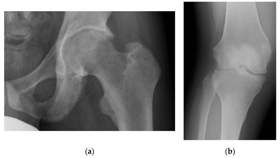 Early osteoarthritis is the other debilitating symptom commonly recognized among adult XLH patients. Development of early osteoarthritis is partly due to abnormal mechanical loading stemming from leg deformity, although it is not fully explained by this [34]. Existence of enthesopathy and excessive ossification in adults with XLH might be associated with the development of early osteoarthritis. We reported the prevalence of hip osteoarthritis (Kellgren–Lawrence grade ≥2, 3) to be 96% and 88%, respectively, and the prevalence of knee osteoarthritis (Kellgren–Lawrence grade ≥2, 3) to be 68% and 36%, which is markedly higher than the general population [4]. Figure 3a,b are typical images of osteoarthritis in the hip and knee joints presented in a 29-year-old male and 30-year-old female with XLH, respectively (Figure 3). As in the case with enthesopathy, conventional therapy did not improve or prevent the development of osteoarthritis in the adults with XLH, while the effect of burosumab on this complication is indecisive.