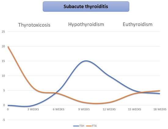 SAT is typically a self-limiting disease. The characteristic triphasic clinical course (Figure 1) arises with a thyrotoxicosis phase lasting 3 to 6 weeks, determined by the damage of thyroid follicular cells and consequent release of thyroid hormones; symptoms of this phase encompass tachycardia, sweating, and weight loss. As thyroid hormone stores are depleted, a hypothyroid phase usually follows and could last up to 6 months; therefore, in some cases, levothyroxine treatment could be needed. In the majority of patients, SAT ultimately results in a full recovery of normal thyroid function [2]. However, in approximately 5–15% of patients, permanent hypothyroidism requiring life-long thyroid replacement therapy might occur [7].