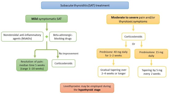 First-line treatment of SAT is based on NSAIDs, such as salicylic acid (600 mg orally every 6 h) or ibuprofen (400 to 800 mg orally every 8 h), for patients with mild to moderate symptoms [122]. Beta-blockers can be used to control thyrotoxic symptoms [122]. Using NSAIDs alone, a complete resolution of pain is expected within 5 weeks, with a reported range of 1 to 20 weeks [1]. Nevertheless, a large retrospective study [123] concluded that NSAIDs fail to provide clinical remission in more than half of SAT patients, with reduced symptomatic relief in patients with higher ESR and CRP levels.