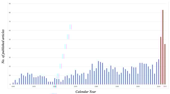 PubMed articles regarding subacute thyroiditis per publication year. Red columns represent years from 2020 to April 2022, since the beginning of COVID-19 pandemic.