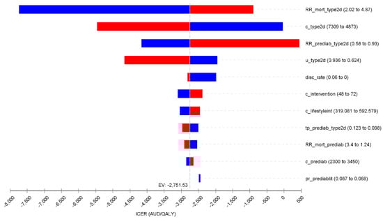Tornado diagram for the one-way deterministic sensitivity analyses. Note: blue bar represents the value of the variable decreases from the base case; red bar denotes the value of the variable increases from the base case. Abbreviations: RR_mort_type2d: Relative risk of mortality in type 2 diabetes; c_type2d: cost of management post type 2 diabetes; u_type2d: utility weights of type 2 diabetes; disc_Rate: discount rate; c_intervention: cost of Identify intervention; c_lifestyleint: cost of lifestyle intervention for prediabetes;tp_prediab_type2d: transition probabili from prediabetes to type 2 diabetes; RR_mort_prediab: Relative risk of mortality in prediabetes; c_prediab: cost management for prediabetes; pr_prediabit: The proportion of prediabetes in “high risk” population as identified in the intervention.