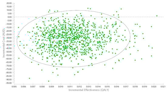 The probabilistic sensitivity analysis showed that 97.7% of results indicated that iDENTify was less costly and more effective (i.e., dominant) than the no screening comparator; the remaining 2.3% of results, whilst not cost-saving, were cost-effective (Figure 3).