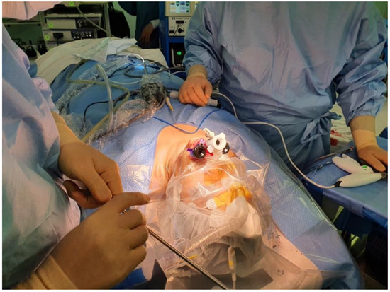 As with other approaches, the transoral approach has adapted robotic console to enhance surgical maneuvering. The first application of robotic surgery for transoral thyroidectomy was established by Richmon et al., in 2010 on a cadaver model [43]. Later, a case series of robotic transoral thyroidectomy on live patients was published in 2011 [44]. The authors found that the sublingual incision limited camera rotation and saw high complication rates. Nakajo et al., was one of the first surgeons to explore the vestibule access to transoral thyroidectomy, where they found significantly decreased complication rates with better surgical movement [45] (Figure 3). As TOETVA provided safer access to thyroid glands through the transoral cavity, more surgeons are adapting robotic console to TOETVA. Robot has allowed for meticulous movement with enhanced access to hard-to-reach spaces. This has allowed for the transoral approach to lateral neck dissection [46]. However, transoral surgeries for cancers are still limited to highly selected patients [47,48], with limited data on long-term outcomes. Moreover, postoperative seroma, infection, and relatively small working spaces compared to other approaches are also reflected in transoral robotic surgery [46,49].
