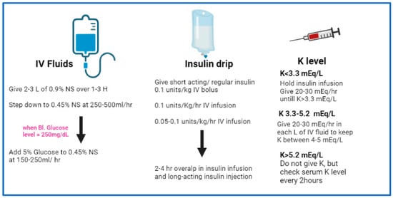 As depicted in Figure 2, early steps of DKA management include: 1—collection of blood for metabolic profile before initiation of intravenous fluids; 2—infusion of 1-L of 0.9% sodium chloride over 1 h after drawing initial blood samples; 3—ensuring potassium level of >3.3 mEq/L before initiation of insulin therapy and 4—initiating insulin therapy only after execution of the initial steps [1,2,3].
