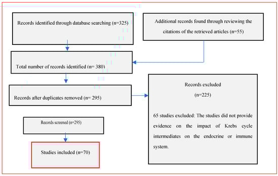 The current study examined the relationship between the Krebs cycle and the endocrine and immune systems. The review process included an analysis of the search results from PsycINFO, PubMed, Web of Science, and CINAHL. The search terms and phrases were “Krebs cycle,” “intermediates,” “endocrine system,” “tricarboxylic acid,” “citric acid cycle,” and “immune system,” and Boolean operators (AND/OR) were used to combine search terms to identify additional sources of evidence for this systematic review. The search was limited to articles that were published in the four electronic databases between 2015 and 2019. The abstracts of the available articles were carefully reviewed to determine their quality and appropriateness (see Figure 1). The initial search yielded approximately 1957 articles. Other parameters, including the study type, publication year, text options, search field tags, and language, were used to limit the search; when these parameters were applied, 325 articles were obtained from the databases, and 55 were obtained through the cross-referencing method. The articles were carefully examined at different stages, as shown in Figure 1, to determine their applicability to this review.