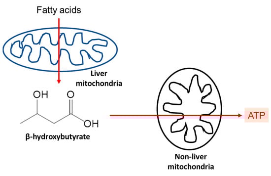 Ketone bodies are alternative sources of energy that the brain and other organs can use when the body is in a prolonged fasting or starved state [20,21]. Generally, ketone bodies refer to three biomolecules which include β-hydroxybutyrate, acetoacetate, and acetone (Figure 1). Among these three molecules, acetone cannot be used and is exhaled via the respiratory tract [22]. The ketogenesis process starts with fatty acid being broken down in the liver to generate acetyl-CoA and ATP (Figure 2) [23], especially during the condition when there is a high glucagon-to-insulin ratio that stimulates the β oxidation of fatty acids [24]. As a result, an excessive amount of acetyl-CoA is produced and overwhelms the oxidation ability of the citric acid cycle. Consequently, acetyl-CoA is converted to ketone bodies. Following the enzymatic metabolism of thiolase, HMG-CoA synthase, and HMG-CoA lyase, ketone bodies are synthesized in the liver and released into the bloodstream [25]. However, the liver and red blood cells cannot utilize ketone bodies as energy sources due to the lack of succinyl CoA-3-oxaloacid CoA transferase (SCOT) which prevents ketone bodies from being broken down before they reach other tissues and organs [25].