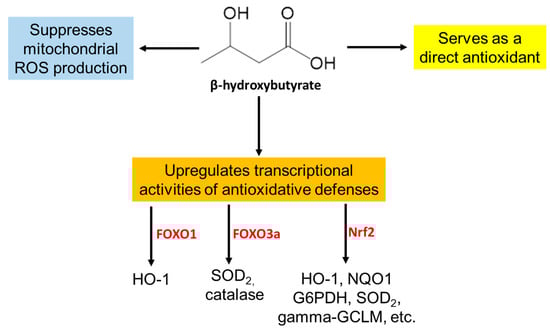 In addition to being a nonhepatic energy source, ketone bodies, in particular, β-hydroxybutyrate, have unique signaling properties and biological functions [20,38,39]. As shown in Figure 3, β-hydroxybutyrate can serve as a direct antioxidant, can inhibit the mitochondrial generation of reactive oxygen species (ROS), and can also serve as a signaling molecule to upregulate transcriptional activities, leading to the expression of cytoprotective proteins, such as HO-1, NQO1, SOD2, catalase, glucose-6-phosphate dehydrogenase (G6PD), and γ-glutathione-cysteine ligase modifier subunit (GCLM) (Figure 3). The transcriptional factors involved in this upregulation by β-hydroxybutyrate have been demonstrated to include FOXO1, FOXO3a, and Nrf2 [20] (Figure 3).