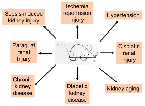 In this review article, we will focus on the renal protective properties of ketone bodies. In particular, we will focus on selected animal models that are represented in the field of ketone body protection in kidney disease, including AKI and CKD. The animal models covered include sepsis-, paraquat- and cisplatin-induced AKI, ischemic kidney injury, hypertension and CKD progression, diabetic kidney disease (DKD), and kidney aging (Figure 4). All these animal models of kidney disease and aging have been widely explored for understanding the pathophysiology of kidney disease and for testing the therapeutic potentials of numerous natural and artificial compounds.