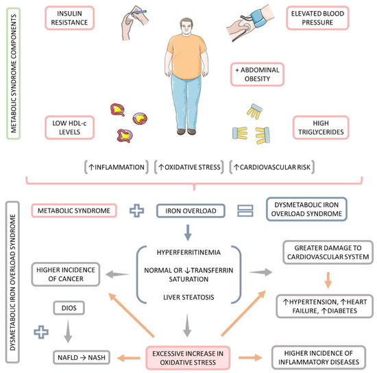 In addition to MtS, authors have described the occurrence of another condition, the dysmetabolic iron overload syndrome (DIOS) corresponds to the increase in the body iron stores, associated with components of MtS, and in the absence of identifiable cause of iron excess [7,8,9,10,11,12,13] (Figure 1). Most DIOS patients also possess nonalcoholic fatty liver disease (NAFLD), a condition that is best defined as metabolic associated fat liver disease (MAFLD) [14]. Although MAFLD, which is also a result of insulin resistance and MtS, is usually but not invariably followed by expanded body iron stores, iron depletion can attenuate steatosis in MAFLD [10,15,16,17]. The histological patterns found in DIOS associates both mesenchymal and parenchymal areas. The iron deposition on the hepatic reticuloendothelial system cells is implicated with increased hepatic apoptosis in MAFLD patients, additionally to higher percentages of advanced hepatic fibrosis, higher portal inflammation, and augmented hepatocellular ballooning [18,19,20,21,22,23]. Figure 1 summarizes DIOS definition visually.