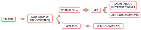 Hyperferritinemia is a condition where excessively high levels of ferritin are observed, indirectly indicating iron overload, which damages the myocardium, the liver, and several other tissues, increasing morbidity and mortality (Figure 3). Nevertheless, more than 90% of hyperferritinemia cases are derived from four major causes: inflammatory conditions, cytolysis, alcoholism, and MtS. Another critical cause that should be seen separately is genetic hemochromatosis. The differentiation of these conditions can be performed with laboratory tests such as hemogram, transferrin saturation, liver function tests, creatinine phosphokinase (CPK), C reactive protein, glycemia, total cholesterol, and triglycerides. Immune and autoimmune affections can also possibly cause hyperferritinemia [54,58,59,60,61,62].