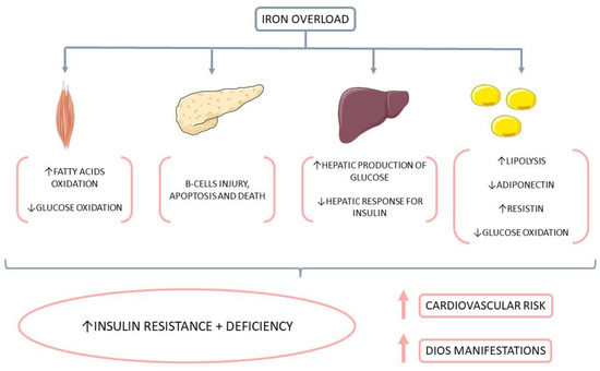 DIOS was defined in the 1990s and shows a close relationship between hepatic iron overload and features of MtS in subjects without apparent cause of iron overload. It is more frequent than genetic hemochromatosis, and most patients are middle-aged males [8,12,13,22,39,41,62,103]. Now that MtS is increasing worldwide, the presence of DIOS follows this tendency. Figure 5 shows some consequences of iron overload in β-cell, muscle, and adipocyte.