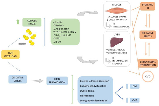 Studies with dietary iron loading animals showed increased resistin expression and reduced leptin levels. Increased resistin and decreased leptin levels contribute respectively to IR and increased appetite. These two conditions together increase the chances of developing obesity and DM. The metabolism of adipose tissue results in increased resistin, TNF-α, IFN-γ, interleukins (IL-6, IL-8, and IL-12), free fat acids (FFA), and a decrease in leptin, and IL-10 levels. This secretory pattern leads to an increase in the inflammatory activity in obese patients (low-grade inflammation) [106,107] showed that leptin directly interferes with iron metabolism. These authors showed that leptin levels were lower in leptin-deficient mice and higher in leptin receptor-deficient when compared with control. These results of this study suggest that the activation of the leptin receptor has effects on hepcidin expression. Authors concluded that this inappropriate signaling of this hormone could nearly link obesity, MtS, CVD, autoimmunity, and cancer. In this sense, iron-mediated OS could also be contributing to this unfavorable scenario.