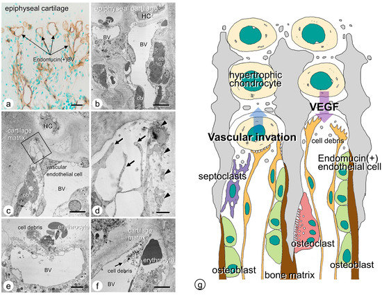 Vascular endothelial cells at the chondro-osseous junction. (a) Endomucin-immunoreactive (brown color) blood vessels at the chondro-osseous junction under light microscope. (b–f) TEM images of blood vessels at the chondro-osseous junction. Invading blood vessels are seen beneath the chondrocytic lacunae. (c,d) When observed under higher magnification as shown in panel c, fine cytoplasmic processes (arrows) are seen extending from the vascular endothelial cell, with invaginations of the cell membranes in the superficial layer of the cartilaginous matrix. (e,f) Panel e demonstrates cell debris, including erythrocytes from the blood vessels, and panel f reveals an erythrocyte outside the vessel and cell debris in the vessels. (g) Schematic design of vascular invasion at the chondro-osseous junction. HP: hypertrophic chondrocyte; BV: blood vessel, ob: osteoblast. Bar, (a) 20 µm, (b) 10 µm, (c,e,f) 5 µm, (d) 1 µm.